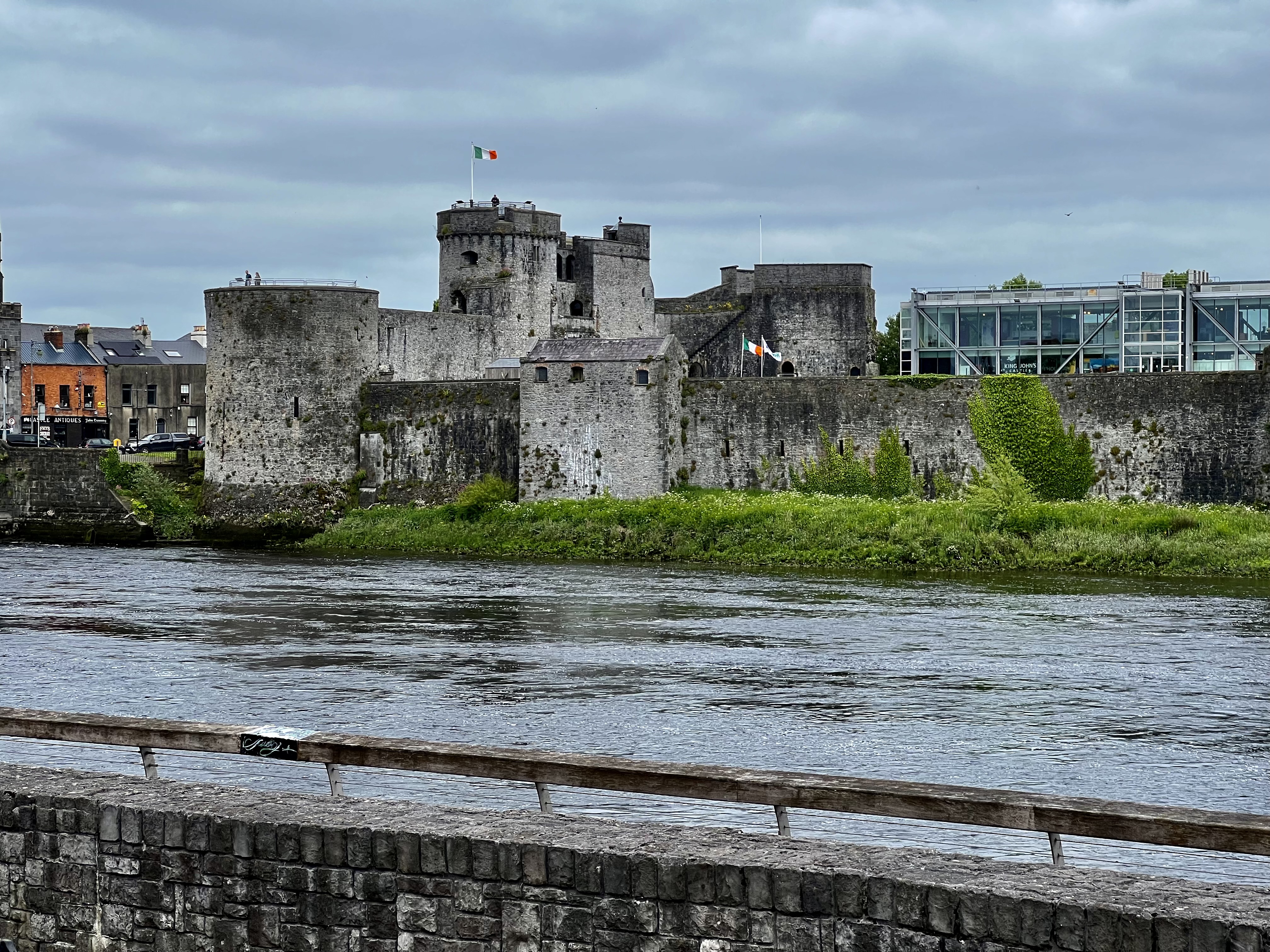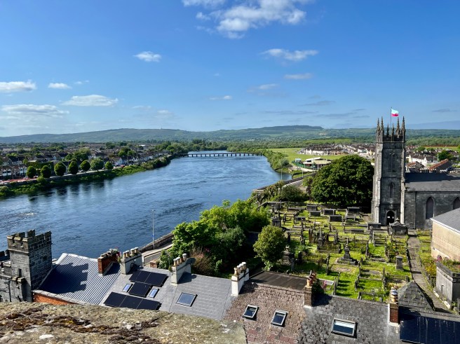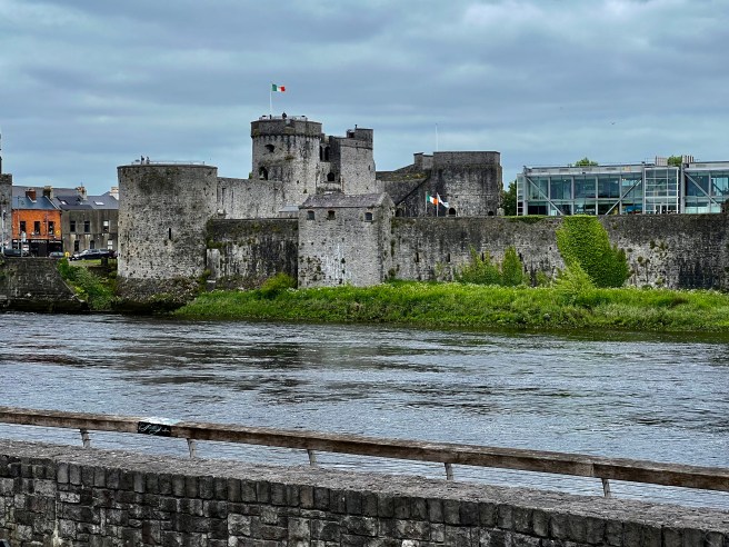 View of the River Shannon and King John’s Castle below: The Normans arrived in Ireland in 1169, and made Limerick a Royal city, then started to build this castle. They put it under the direct rule of King John of England, Lord of Ireland.