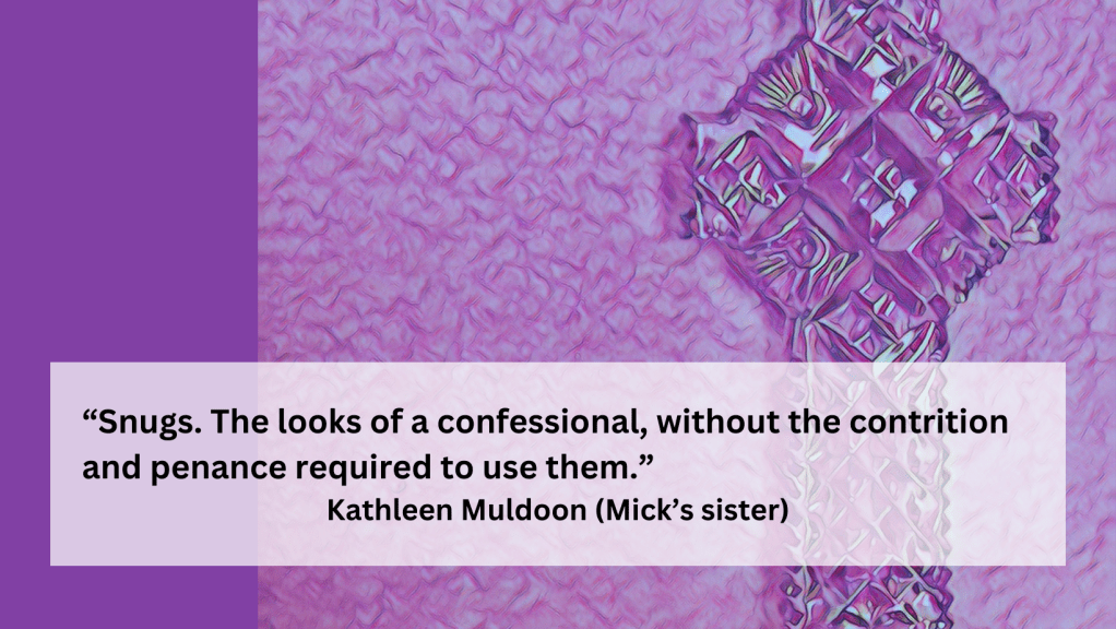 In 1866 Ireland, snugs were small enclosures within pubs where women could be concealed while they drank. Others used them as well to “hide” them from patrons. Kathleen is Mick’s youngest sister.